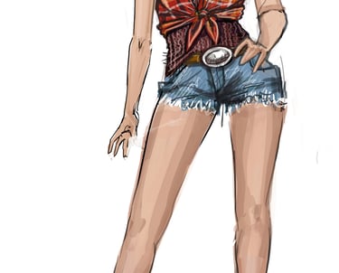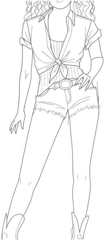 Aging/Distressing: Denim shorts and cowboy boots should be lightly weathered to read as “lived in” rather than stage-new.