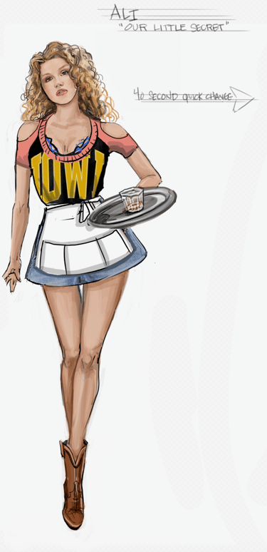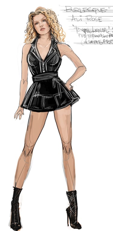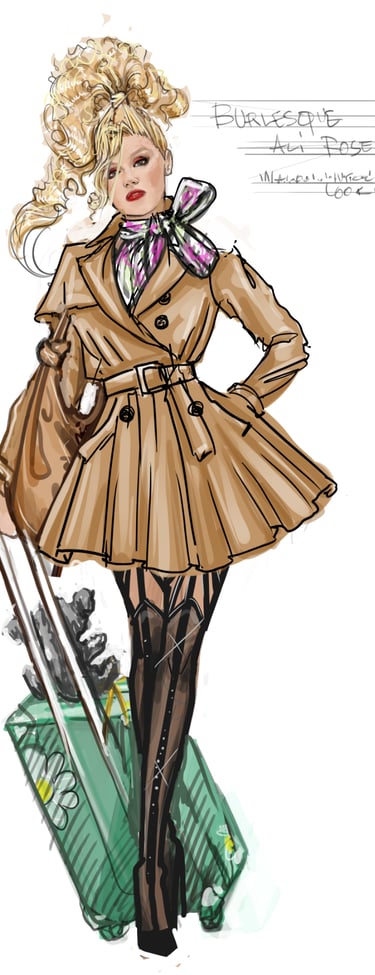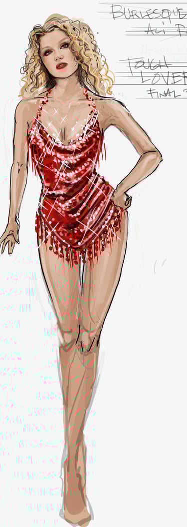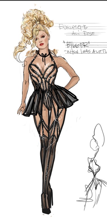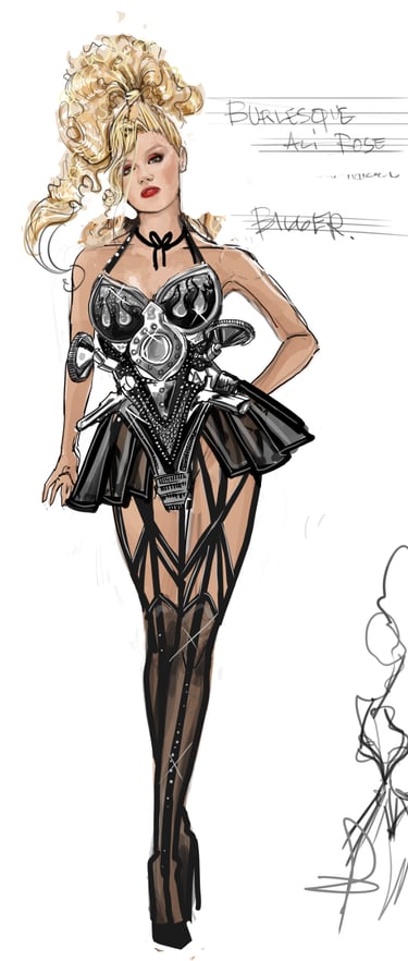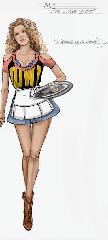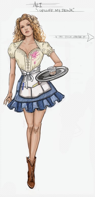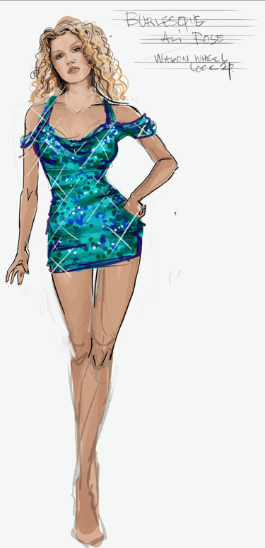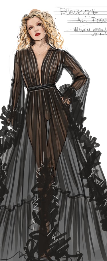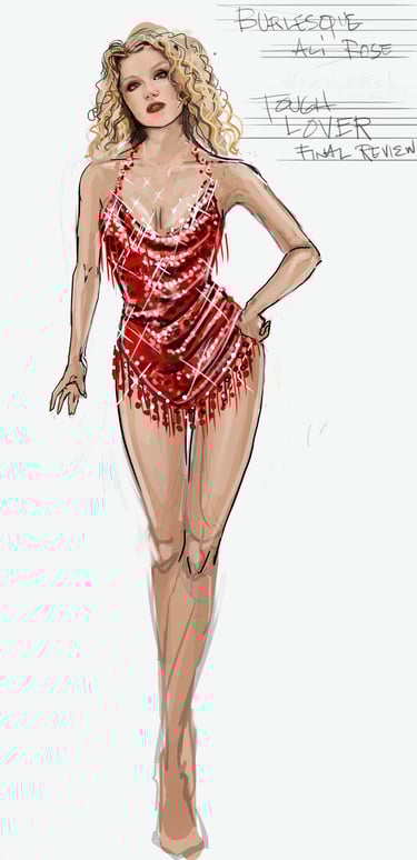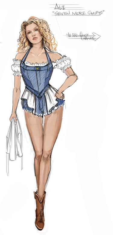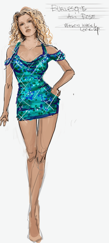 Ali is the heart of the story. Coming from a small-town girl with big dreams who transforms into a burlesque star. Her style aesthetic begins in Iowa with modest, farm-girl clothing that emphasizes innocence and humility. As she travels to New York and finds her place in Tess’s club, her costumes evolve into glamorous, jewel-encrusted burlesque looks, layered with sequins, fringe, and sparkle. Ali’s clothing tells the story of transformation: from naïve outsider to confident star of the stage.