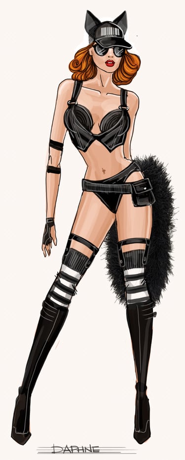 This either goes 70's California, or classic old Hollywood but something punchy, iconoclastic and coiffed coming out from under her cap and glasses