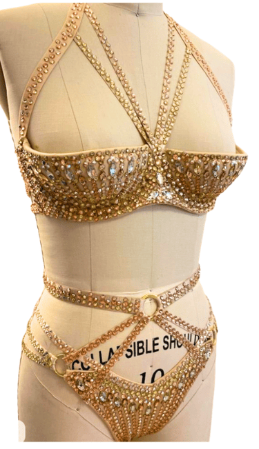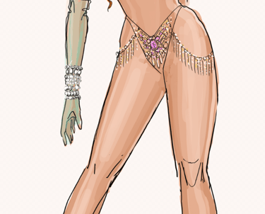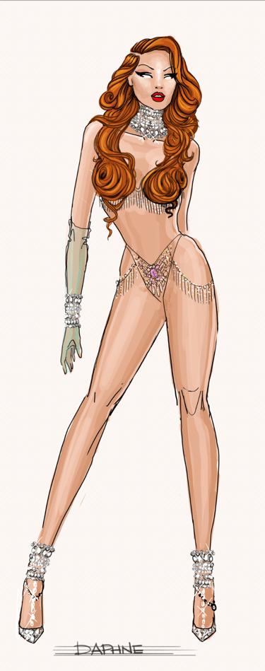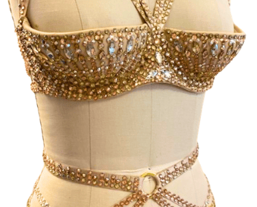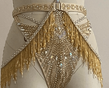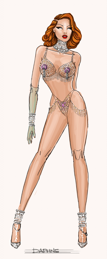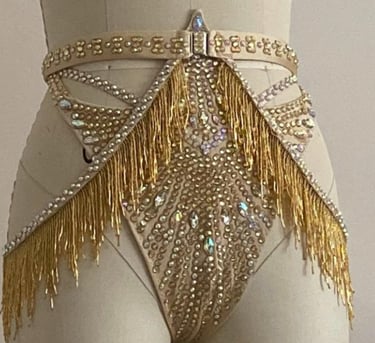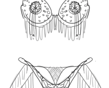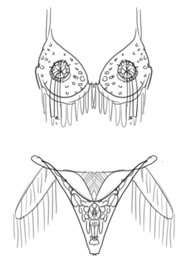 Hair Bra should function as a comedic double take, getting a quick shot of her seemingly topless with long hair, another brush of the fan and a break away bra reveals Nude Illusion Bra w Crystal Areolas and Nipple Tassels