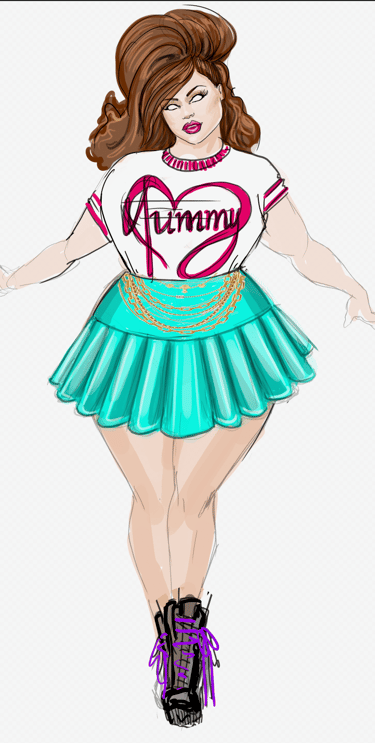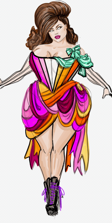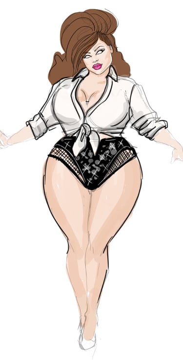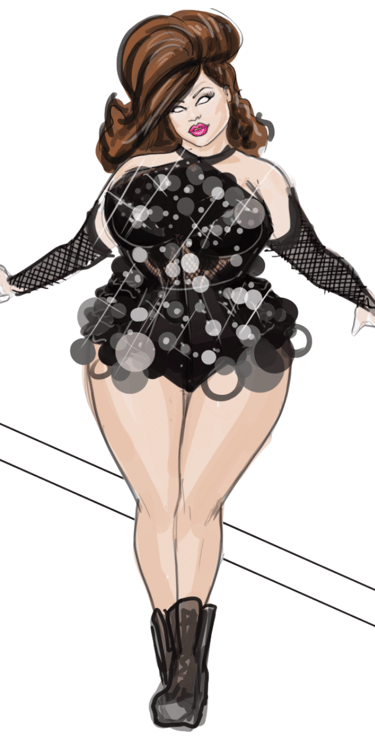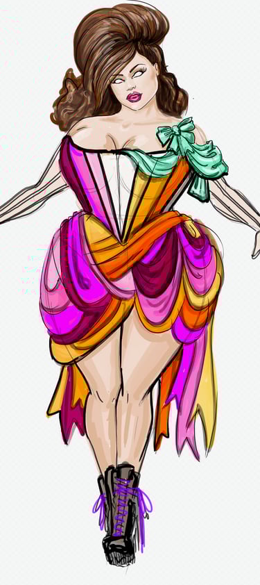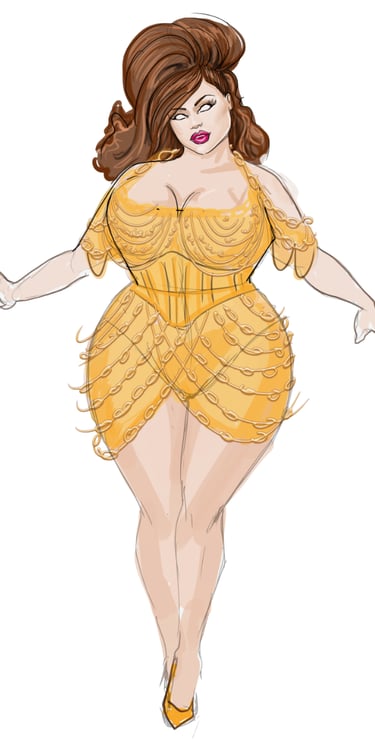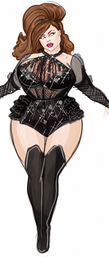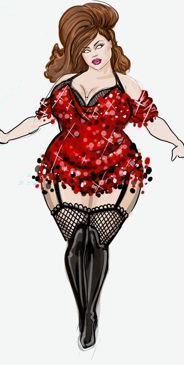 Queenie is a bold and stylish performer whose looks are chic, playful, and sultry. Her costumes emphasize strong silhouettes, with sleek fabrics and glitter accents, often coordinated with Coco. Queenie’s aesthetic blends elegance with sensuality, leaning into glamour while maintaining a sharp, modern edge.