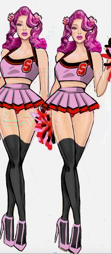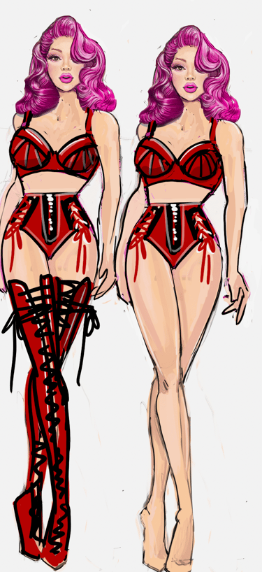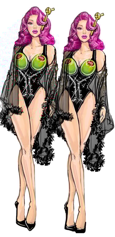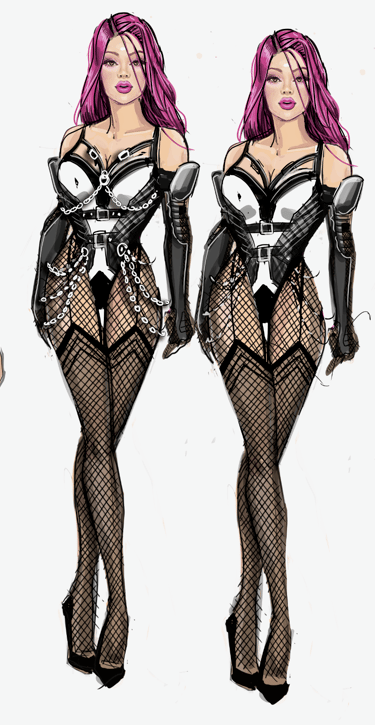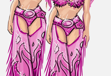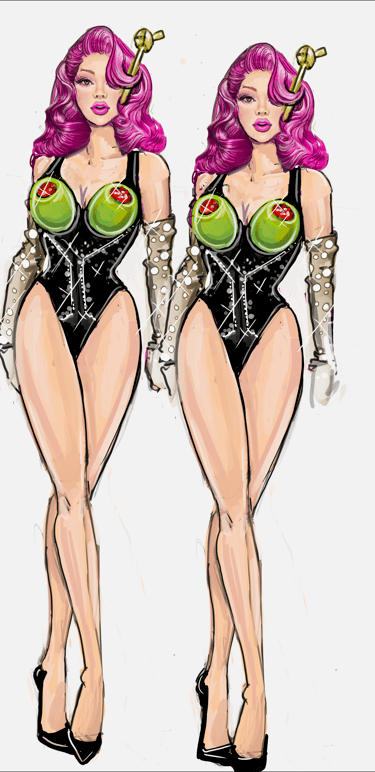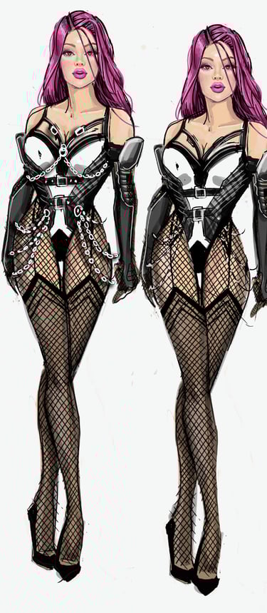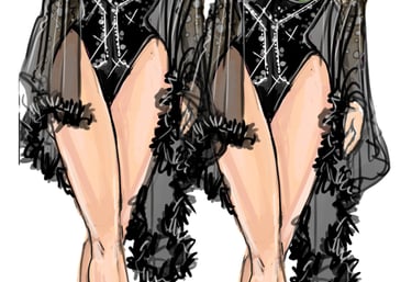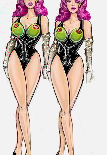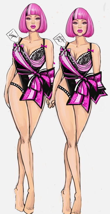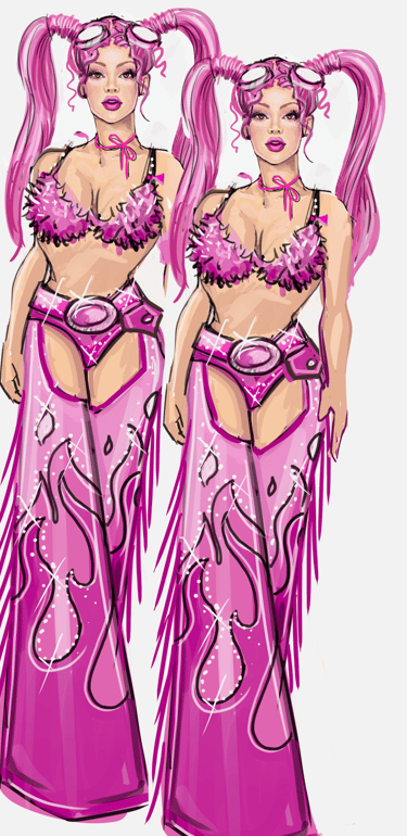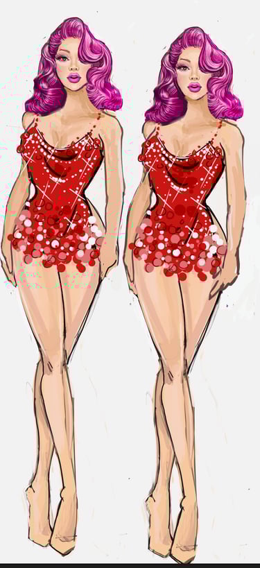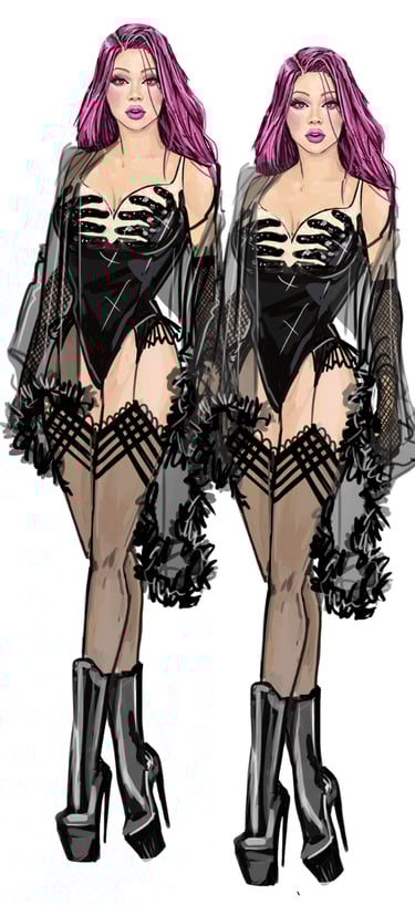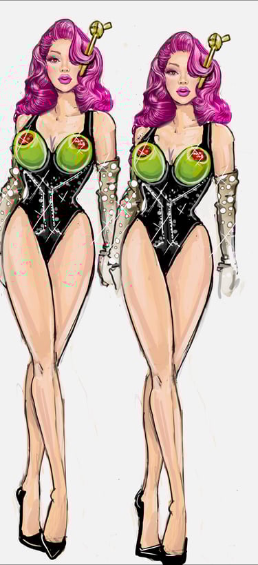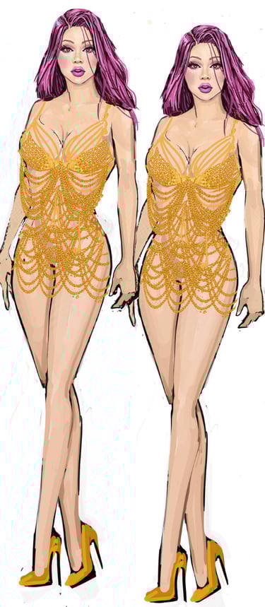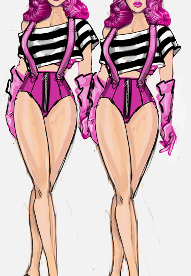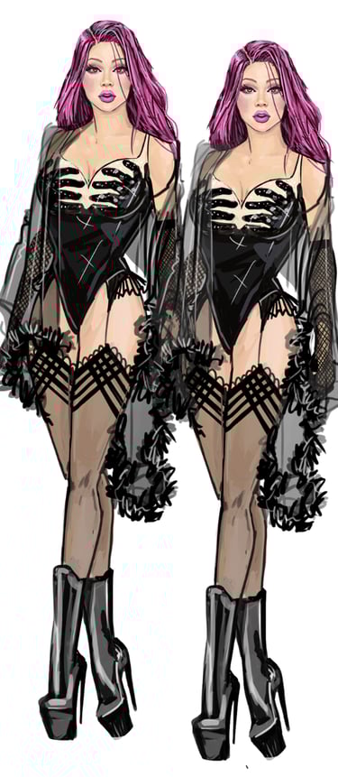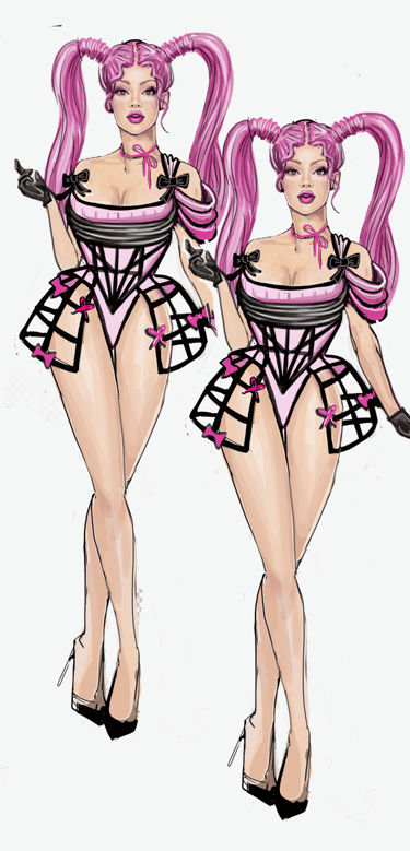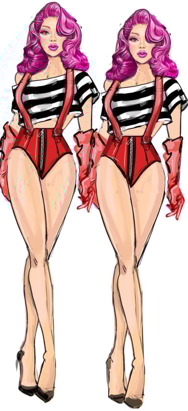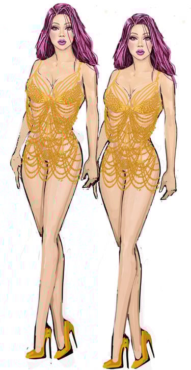 The Twins bring cheeky synchronicity to the ensemble. Their looks are always paired or mirrored with matching fabrics, color palettes, and silhouettes that highlight their duet presence. Their aesthetic is playful, vibrant, and camp, leaning on symmetry and visual humor. Marco Marco emphasizes their twin identity through coordinated embellishments.