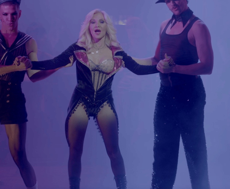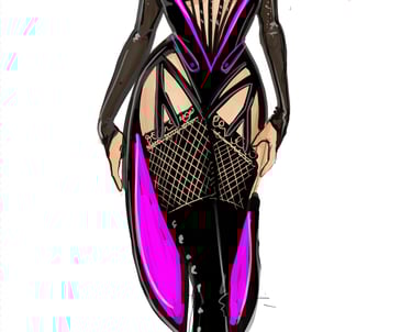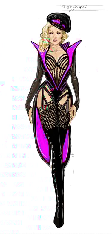 Tess makes her entrance in a commanding couture-inspired ensemble that declares her as the undisputed queen of the club. The look combines sharp black vinyl tailoring, bold magenta accents, and dramatic thigh-high boots, creating a silhouette that is both powerful and glamorous. With its exaggerated lapels, cage-style bustier, and sparkling embellishments, the design blends haute couture sophistication with burlesque spectacle. This opening costume immediately communicates Tess’s authority, her love of designer fashion, and her role as the glamorous heart of the Burlesque stage.