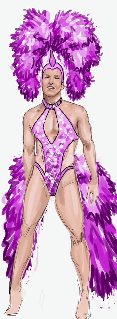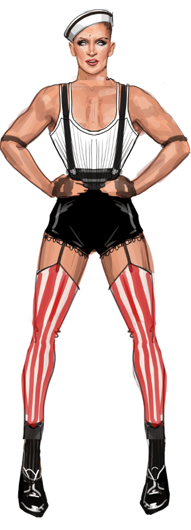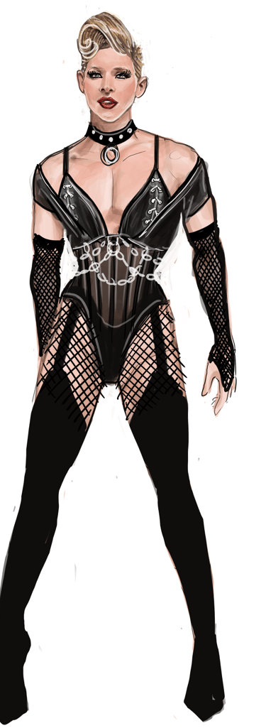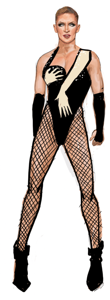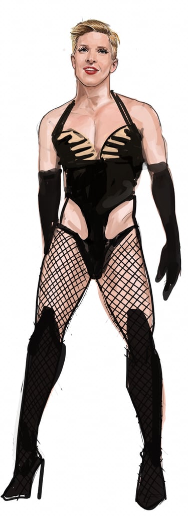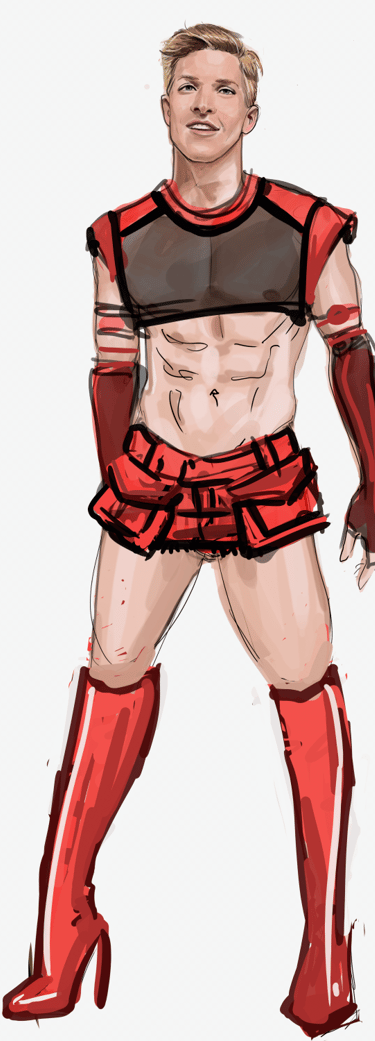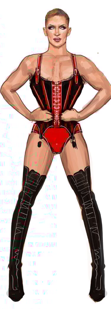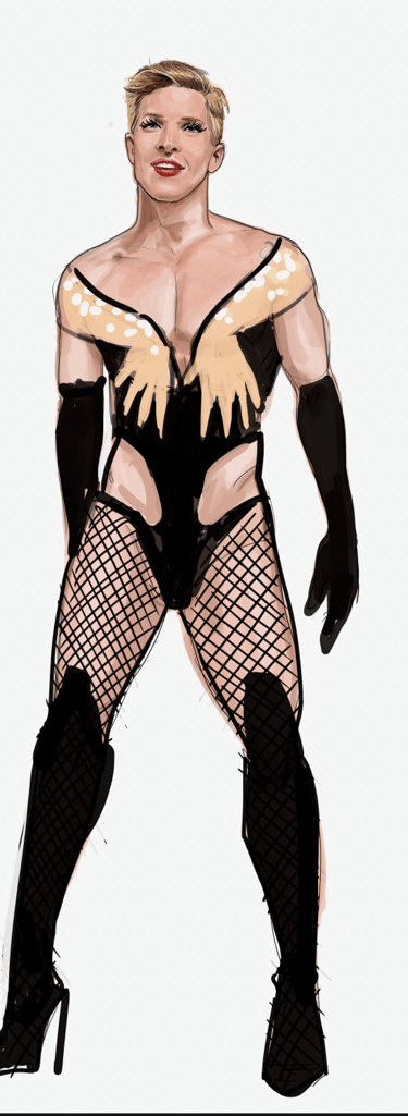 Trey, also known as Chardonnay, is the boylesque act. A campy, sexy, comedic, and bold personality and performer. Their costumes are revealing, often incorporating corsetry, high heels, and playful gender-bending elements. The aesthetic is campy and confident, pushing boundaries with humor and sensuality. Chardonnay’s look is built for both spectacle and comedy.